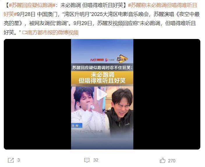 9月29日,苏醒发出视频回应自己跑调的事情,我们可以看到,在视频中,苏醒听自己演唱的《夜空中最亮的星》,然后忍不住笑场了,其实,苏醒并没有跑调,但他的演唱确实不好听。