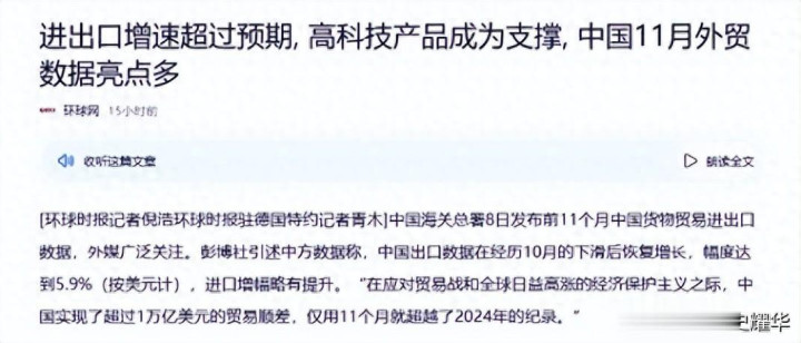 东盟作为中国第一大贸易伙伴,前11个月贸易总值达到6.82万亿元,增长8.5%,光对东盟出口就比去年多了723亿多美元。欧盟也没跟着美国的节奏走,对华出口增长8.1%,384亿美元的增量实实在在。