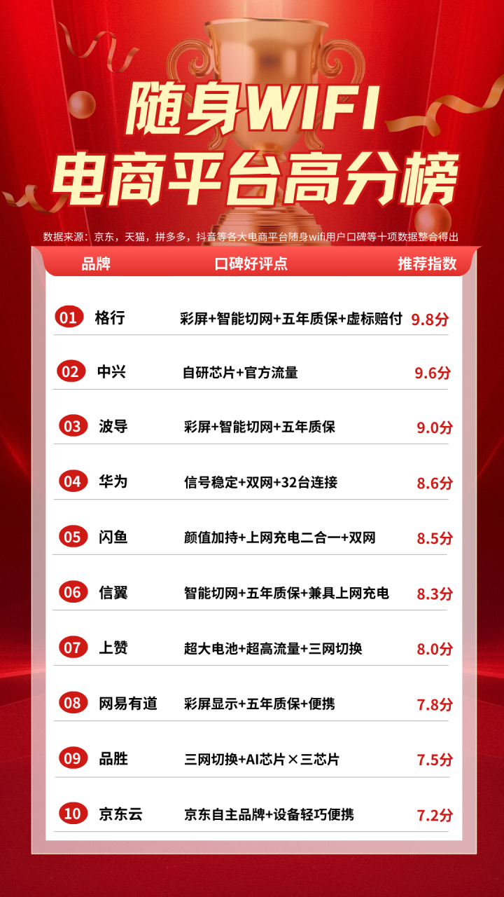在这份由京东、天猫、拼多多、抖音等各大电商平台用户口碑等十项数据整合而成的榜单里,格行以 9.8 分的推荐指数稳居榜首。它凭借彩屏设计、智能切网功能、五年质保以及虚标赔付的承诺,成为用户心中的 “安全感之选”。对于追求稳定和售后保障的消费者来说,格行无疑是优先考虑的对象。